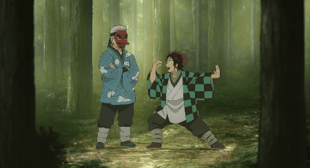a) 탄지로 : (N) 오늘은 구르기 축제. 어떤 자세에서도 낙법을 이용해 재빨리 일어나는 훈련이다.