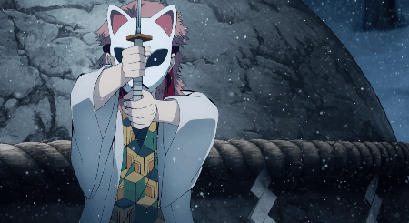 (탄지로의 공격에 사비토의 여우 가면이 두 동강 나며 얼굴이 드러난다.) ■