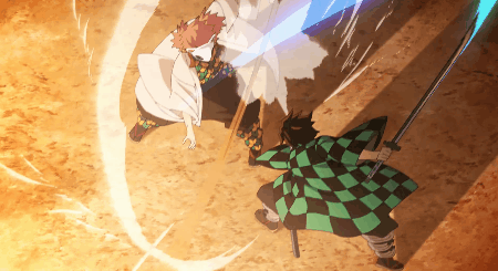 a) 탄지로 : (N, 힘겨운) 팔이, 다리가 갈기갈기 찢어질 것처럼. 배가, 심장이 터질 것처럼 칼을 휘둘렀다.