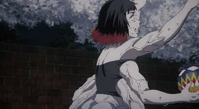 (야하바를 향해 날아오는 공을 네즈코가 발로 차 막아준다.)