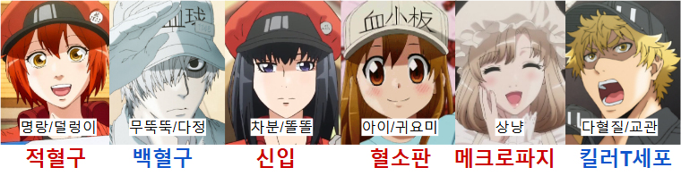 남 - d) 킬러T세포, 외부 적혈구1, 백혈구2, 사령관, 요원2, 적혈구1,4, 세포1,4, 경보방송