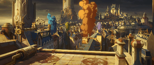 (징크스의 폭탄으로 온 도시가 독가스와 페인트로 뒤덮인다.)