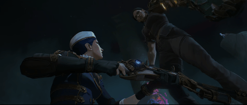 (그때, 케이틀린이 쏜 총에 징크스의 중지가 날아간다.)