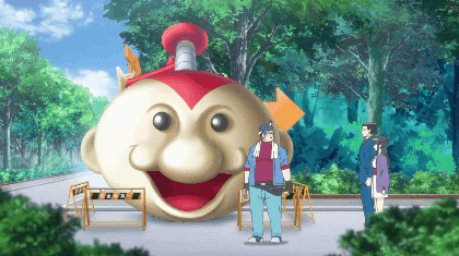a) 나루호도 : 이부쿠로 씨는 니보시 씨가 낮잠 자는 동안 토노사맨의 인형옷을 훔쳐 게이트를 지나 스튜디오로 갔어.