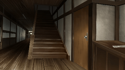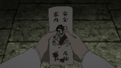 (켄을 자기가 있는 벽이 파인 쪽으로 옮긴 후 대문에 부적을 붙인다.)