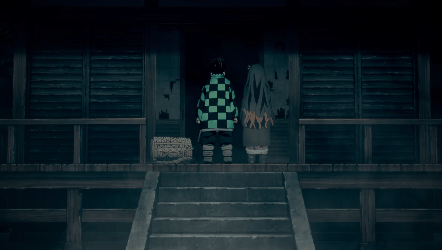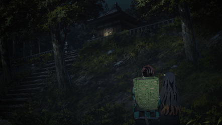 a) 탄지로 : (발견, 화색) 엇, 사당이 있어. 불빛이 새어나오는 걸 보니 누가 있는 것 같은데? 한번 가보자. ▶03