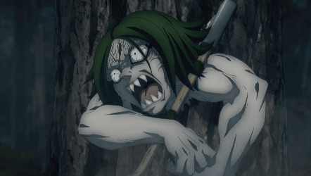 (도끼로 혈귀의 머리를 찍은 뒤 나무로 던진다.)